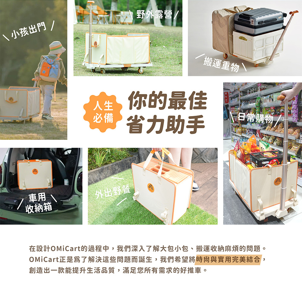 在設計OMiCart的過程中,我們深入了解大包小包、搬運收納麻煩的問題。OMiCart正是為了解決這些問題而誕生,我們希望將時尚與實用完美結合,創造出一款能提升生活品質,滿足您所有需求的好推車。