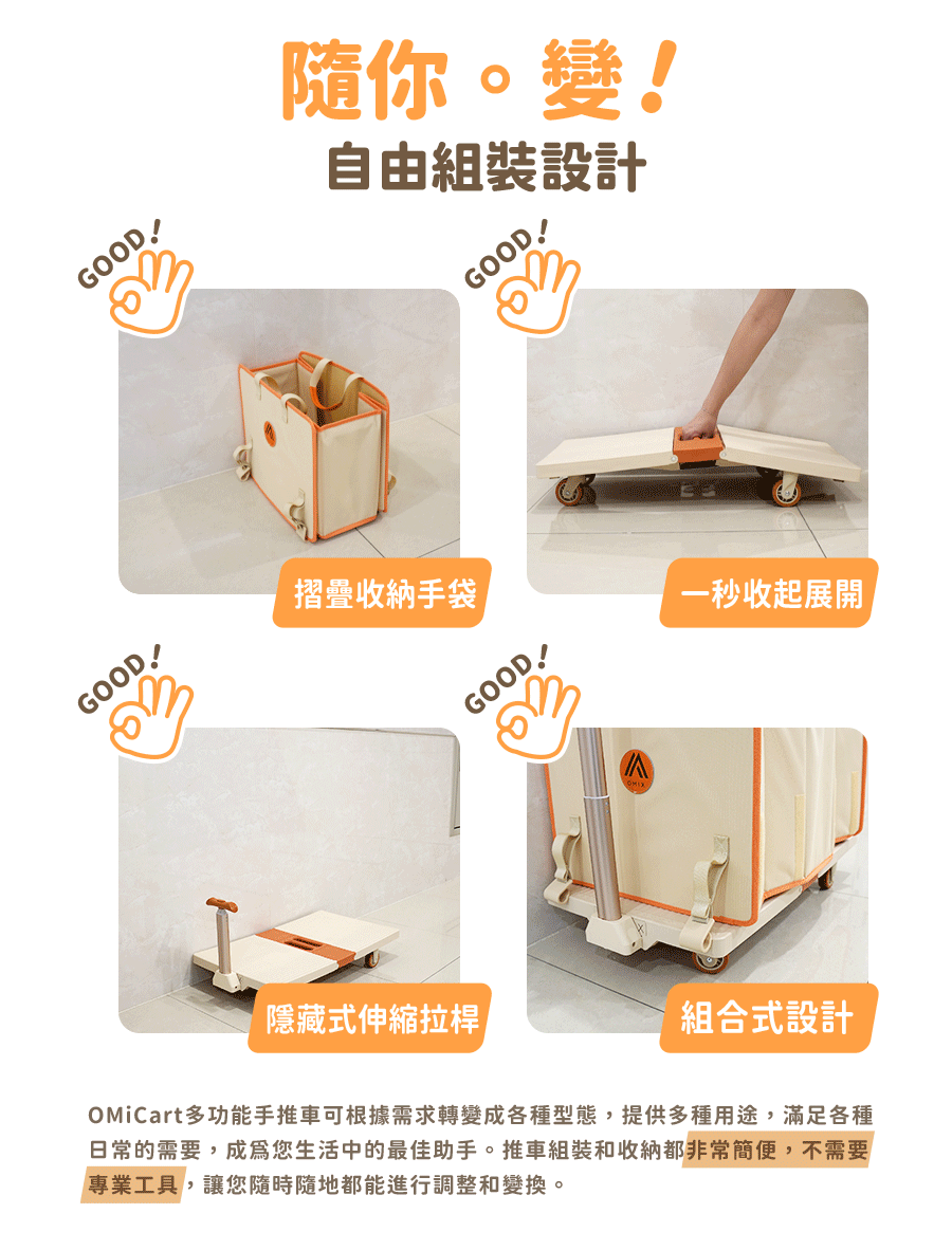 OMiCart多功能手推車可根據需求轉變成各種型態,提供多種用途,滿足各種日常的需要,成為您生活中的最佳助手。推組裝和收納都非常簡便,不需要專業工具 , 讓您隨時隨地都能進行調整和變換。