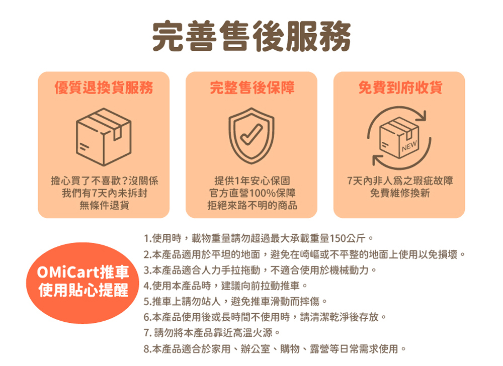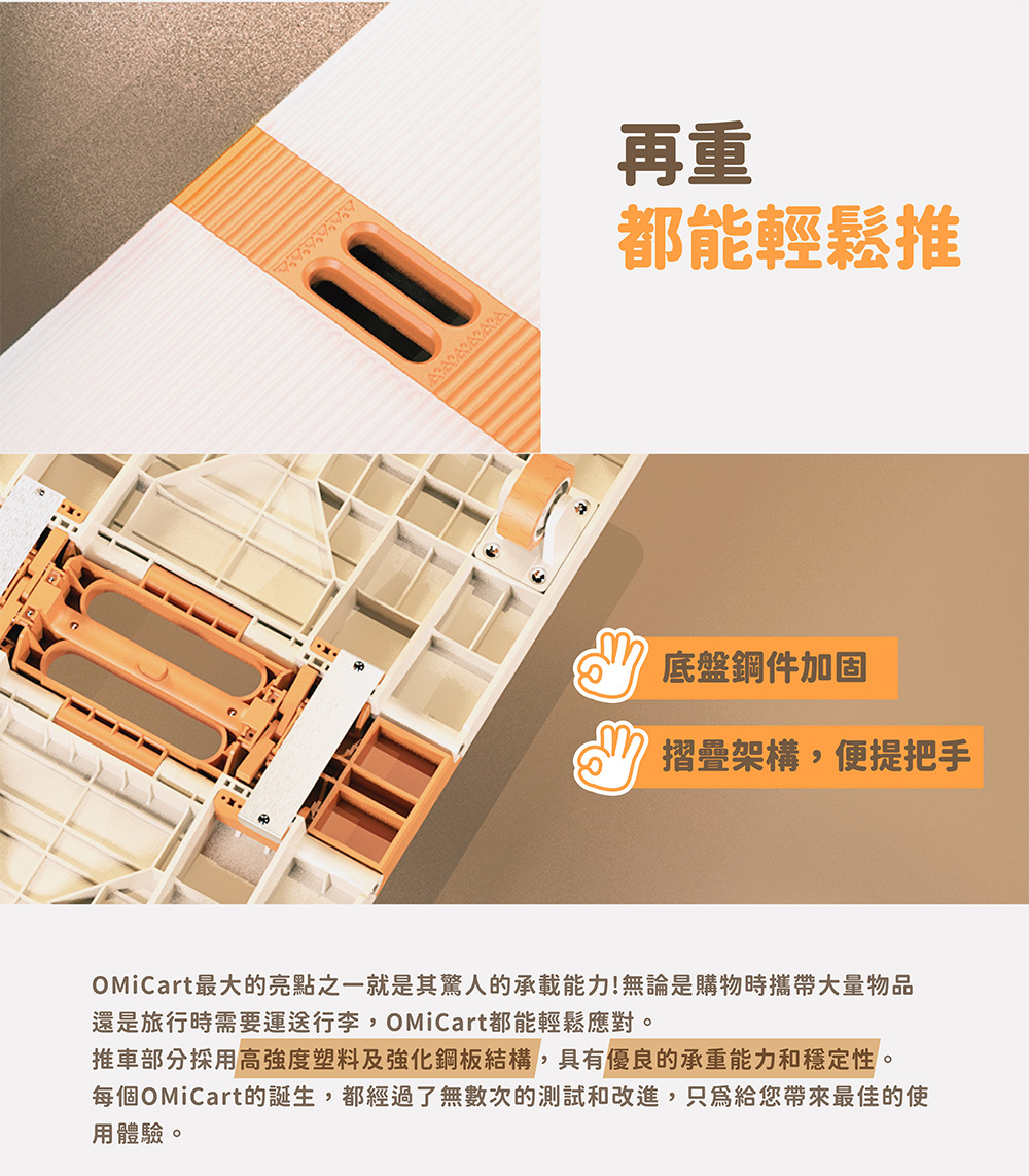 OMiCart最大的亮點之一就是其驚人的承載能力!無論是購物時攜帶大量物品還是旅行時需要運送行李,OMiCart都能輕鬆應對。推車部分採用高強度塑料及強化鋼板結構,具有優良的承重能力和穩定性。每個OMiCart的誕生,都經過了無數次的測試改進,只為給您帶來最佳的使用體驗。