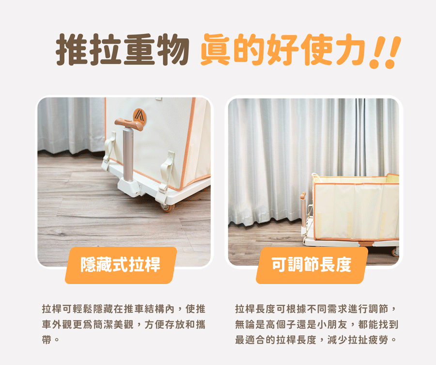 隱藏式拉桿 GOOD!拉桿可輕鬆隱藏在推車結構內,使推車外觀更為簡潔美觀,方便存放和攜帶。