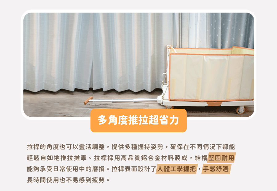 拉桿的角度也可以靈活調整,提供多種握持姿勢,確保在不同情況下都能輕鬆自如地推拉推車。拉桿採用高品質鋁合金材料製成,結構堅固耐用能夠承受日常使用中的磨損。拉桿表面設計了人體工學握把,手感舒適長時間使用也不易感到疲勞。