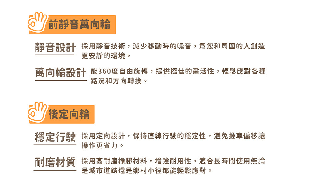 穩定行駛-採用定向設計,保持直線行駛的穩定性,避免推車偏移讓操作更省力。