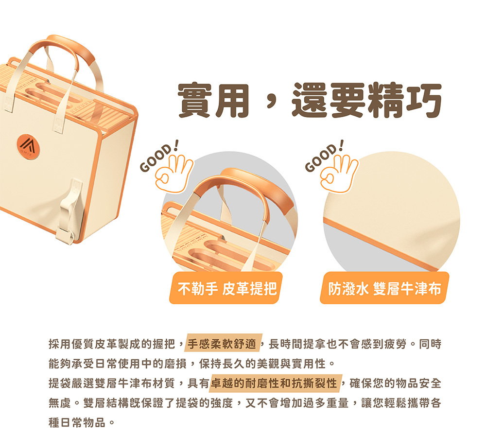 採用優質皮革製成的握把,手感柔軟舒適 ,長時間提拿也不會感到疲勞。同時能夠承受日常使用中的磨損,保持長久的美觀與實用性。提袋嚴選雙層牛津布材質,具有卓越的耐磨性和抗撕裂性 ,確保您的物品安全無虞。雙層結構既保證了提袋的強度,又不會增加過多重量,讓您鬆攜帶各種日常物品。