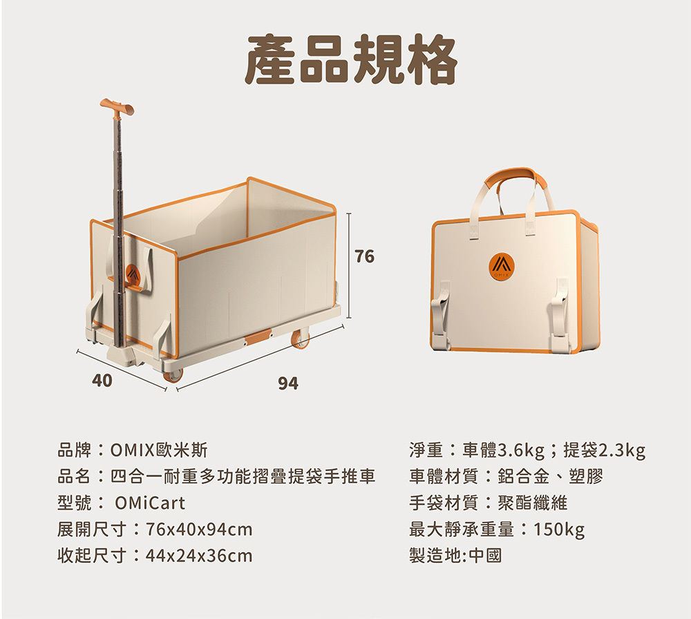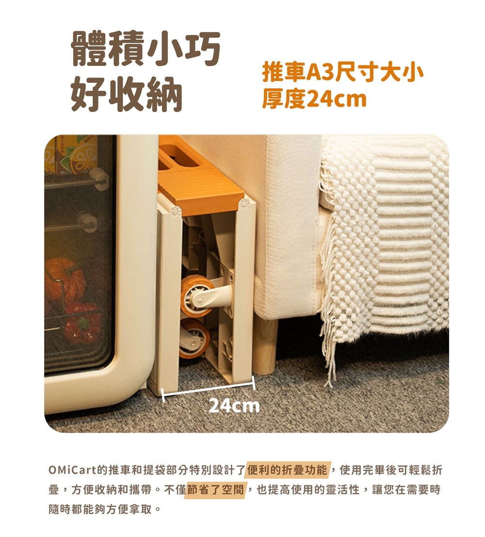 OMiCart的推車和提袋部分特別設計了便利的折疊功能,使用完畢後可輕鬆折疊,方便收納和攜帶。不僅節省了空間,也提高使用的靈活性,讓您在需要時隨時都能夠方便拿取。