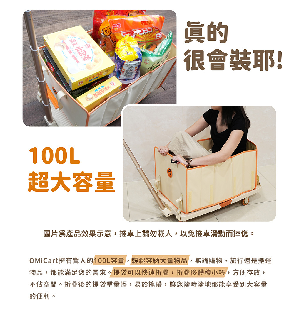 OMicart擁有驚人的100L容量,輕鬆容納大量物品,無論購物、旅行還是搬運物品,都能滿足您的需求。提袋可快速折疊,折疊後體積小巧,方便存放,不估空間。折疊後的提袋重量輕,易於攜帶,讓您隨時隨地都能享受到大容量的便利。