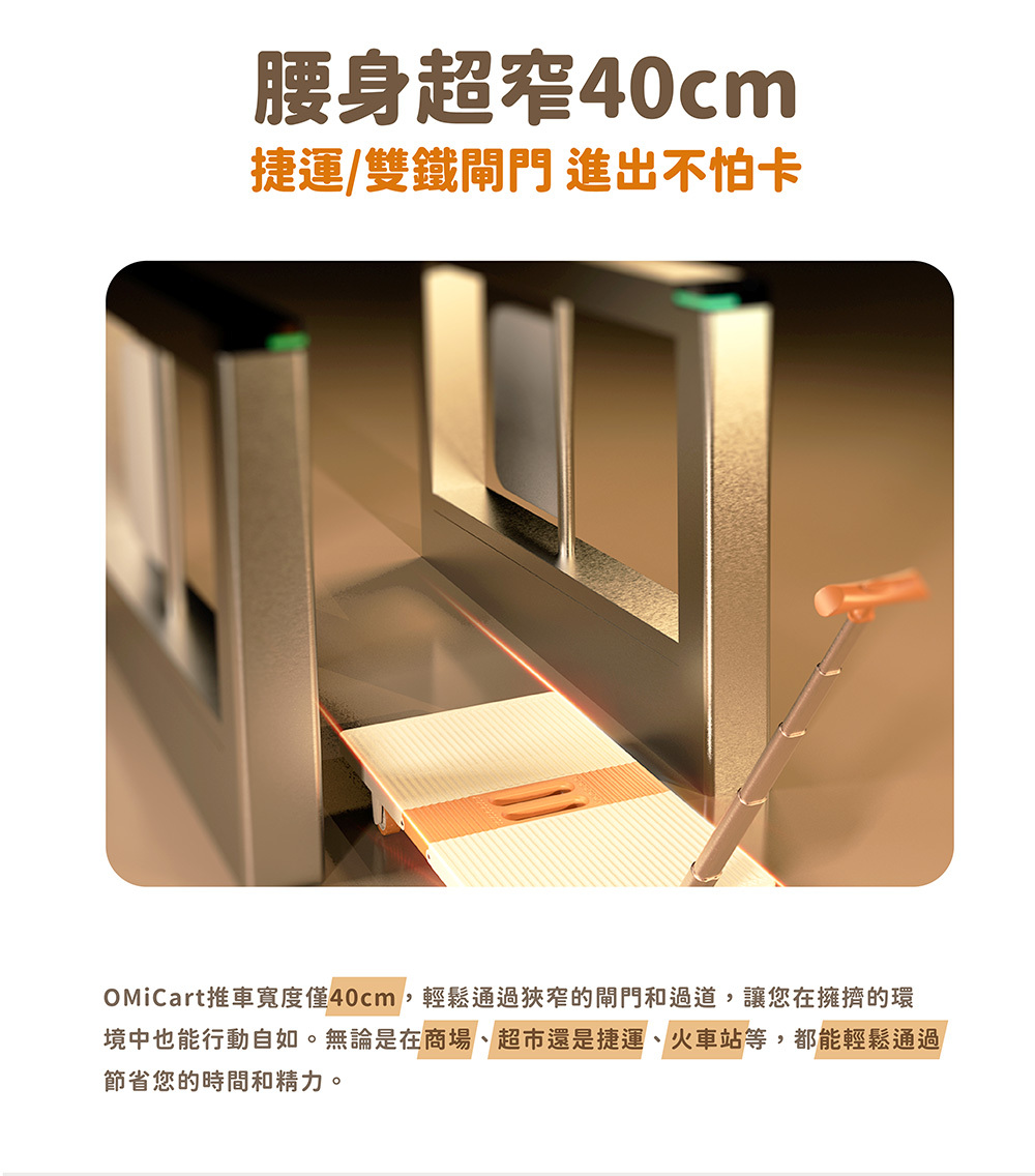 OMiCart推車寛度僅40cm,鬆通過狹窄的閘門和過道,讓您在擁擠的環境中也能行動自如。無論是在商場、超市還是捷運、火車站等,都能輕鬆通過節省您的時間和精力。