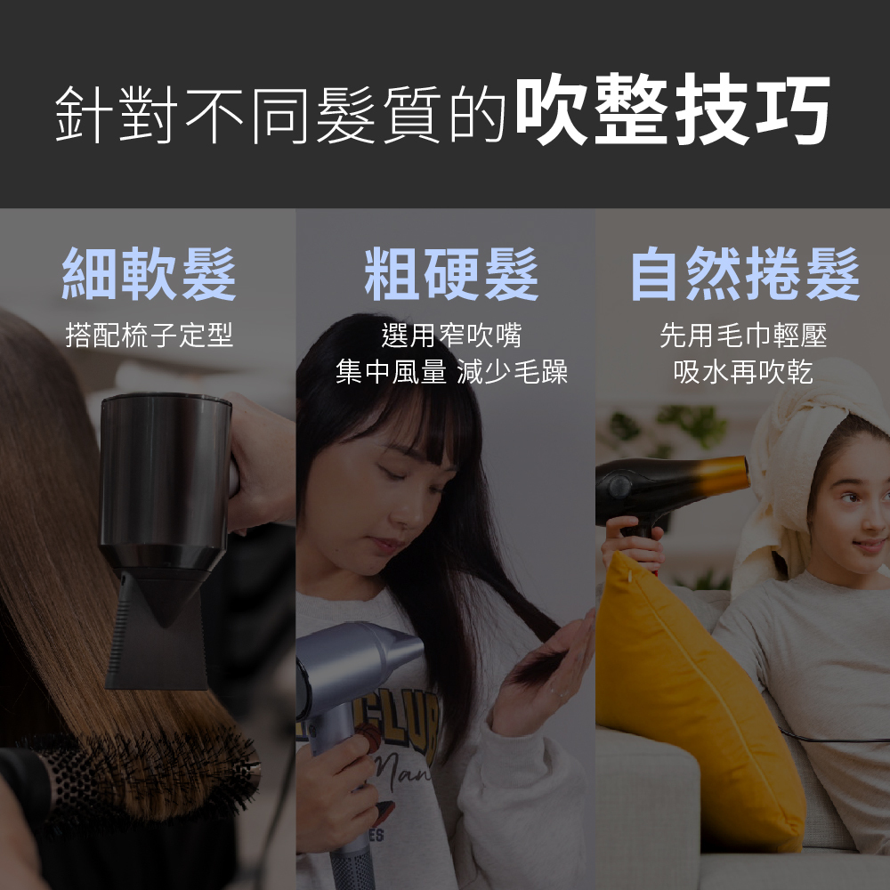 粗硬髮:選擇配有窄嘴的吹風機,以集中風量,幫助毛鱗片的順合,減少毛躁。