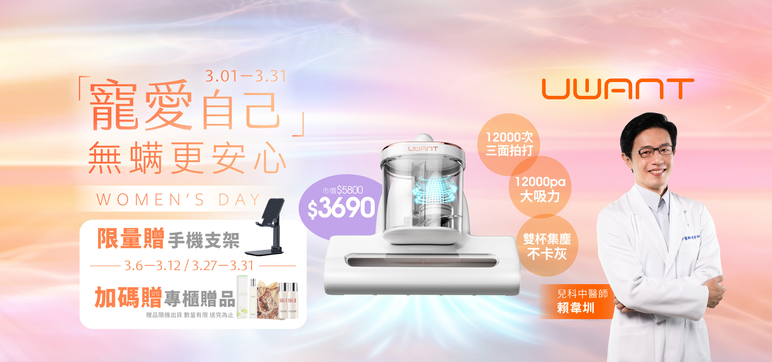 UWANT 智慧雙氣旋吸塵除螨機 限時下單折100,再贈手機支架!