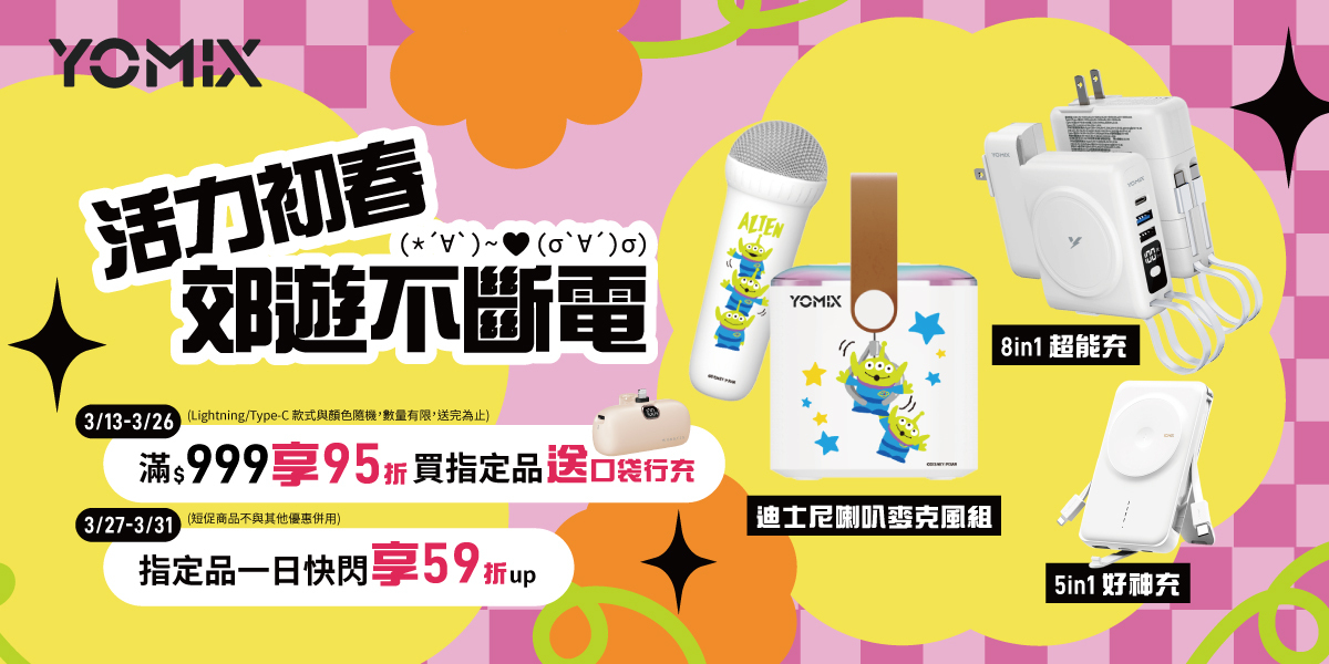 YOMIX聯合品牌 消費滿$999享95折,買指定品贈口袋行動電源