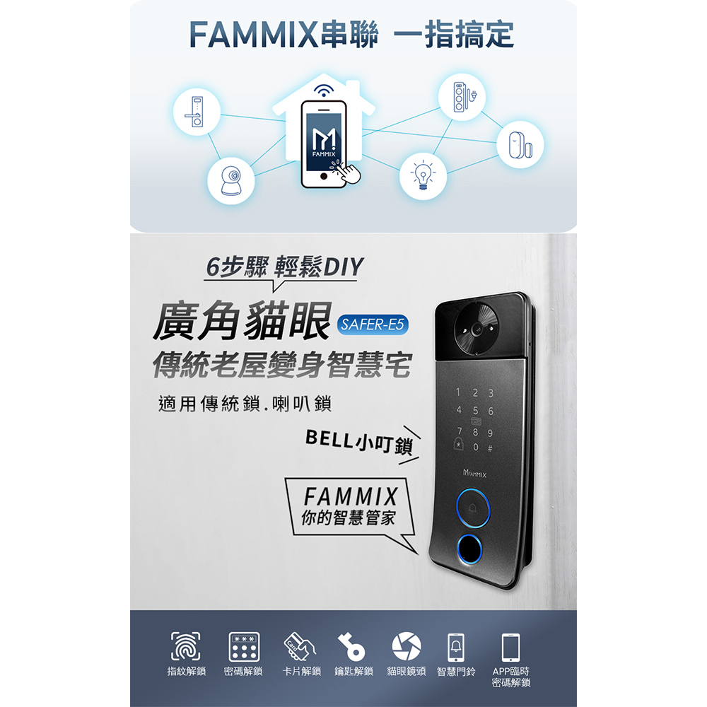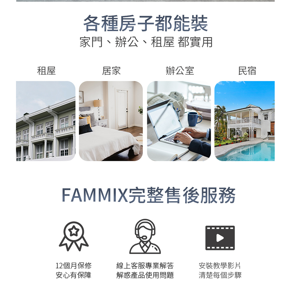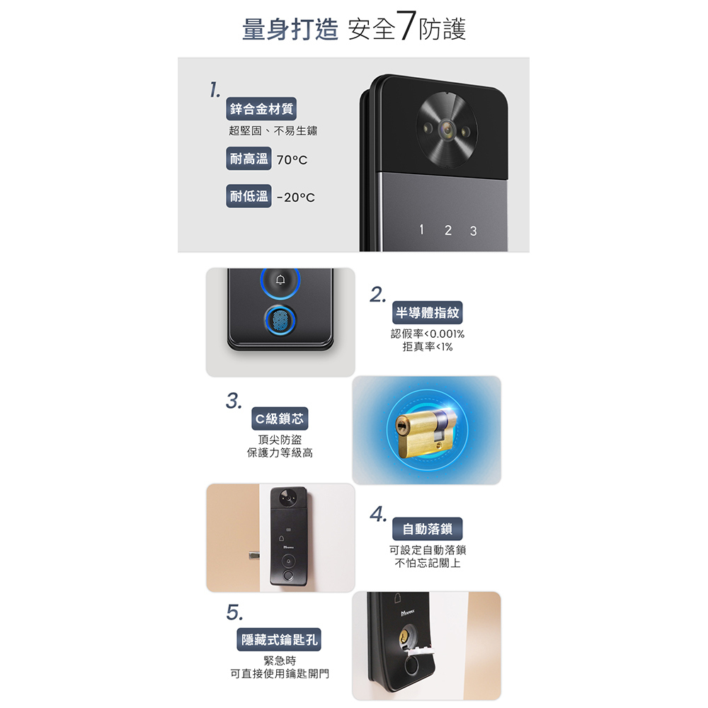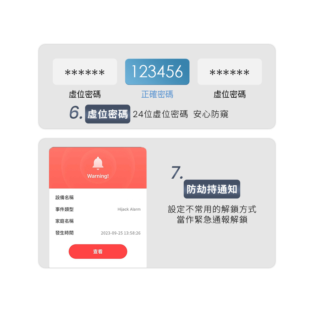 *6大開鎖方式: 指紋 / 密碼 / 感應卡 / 鑰匙 / APP遠程解鎖 / 臨時密碼