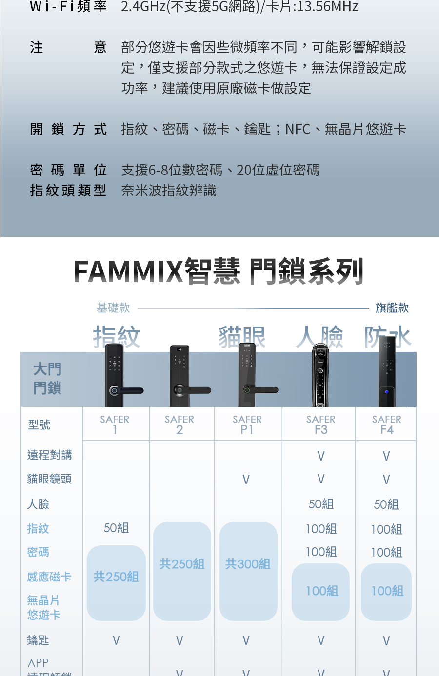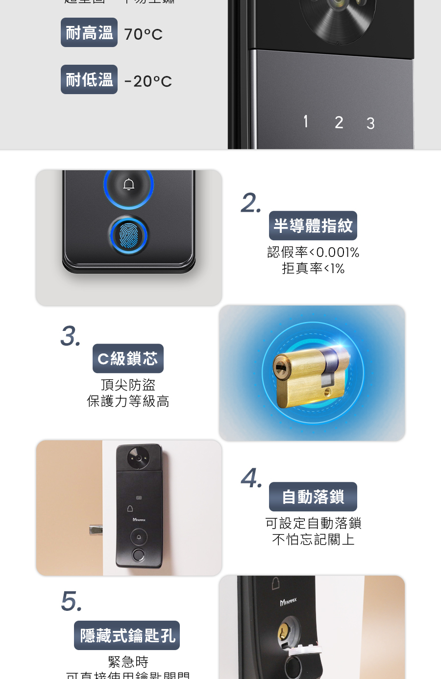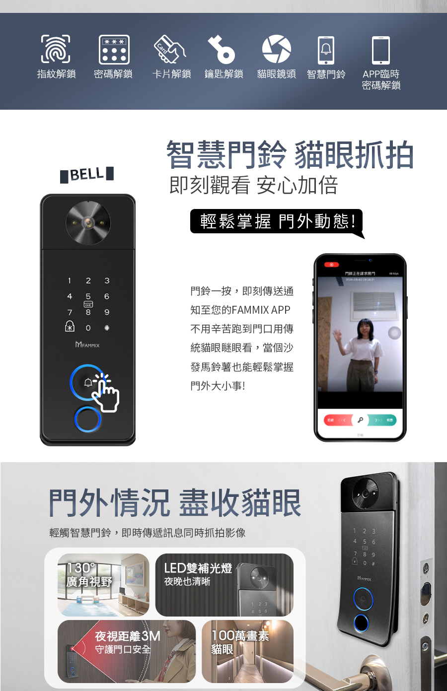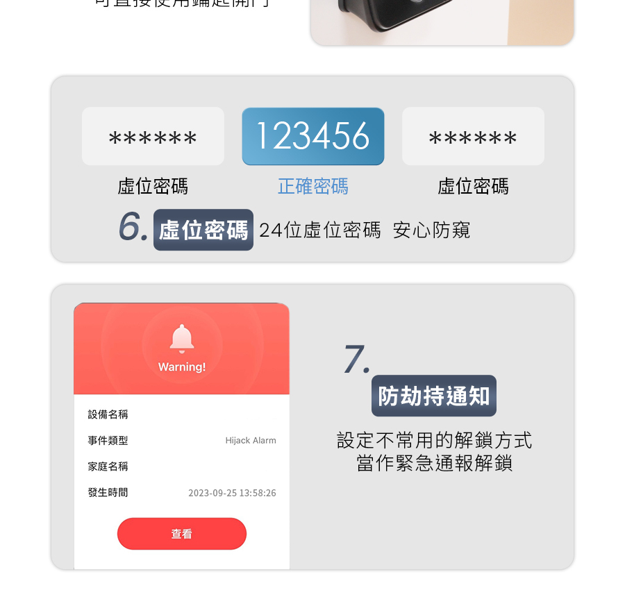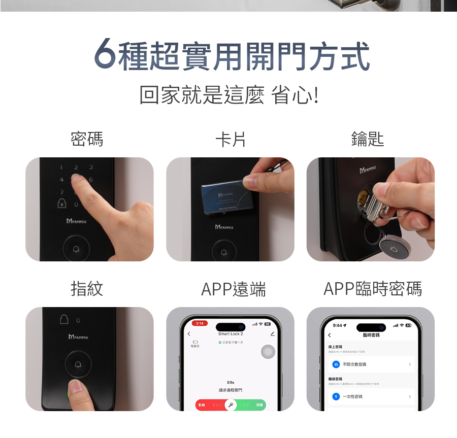 *6大開鎖方式: 指紋 / 密碼 / 感應卡 / 鑰匙 / APP遠程解鎖 / 臨時密碼