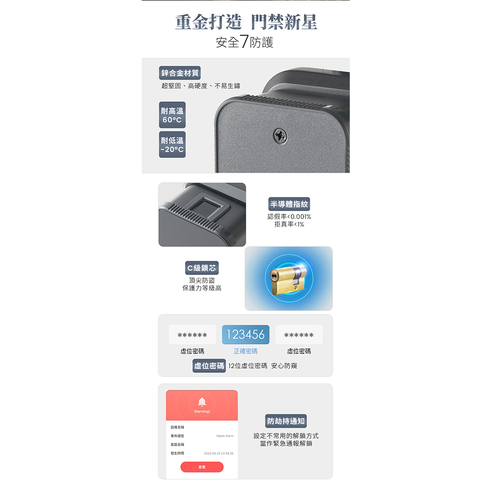 指紋/密碼/鑰匙/卡片/手機APP遠端解鎖/APP遠端臨時密碼 六種開鎖方式