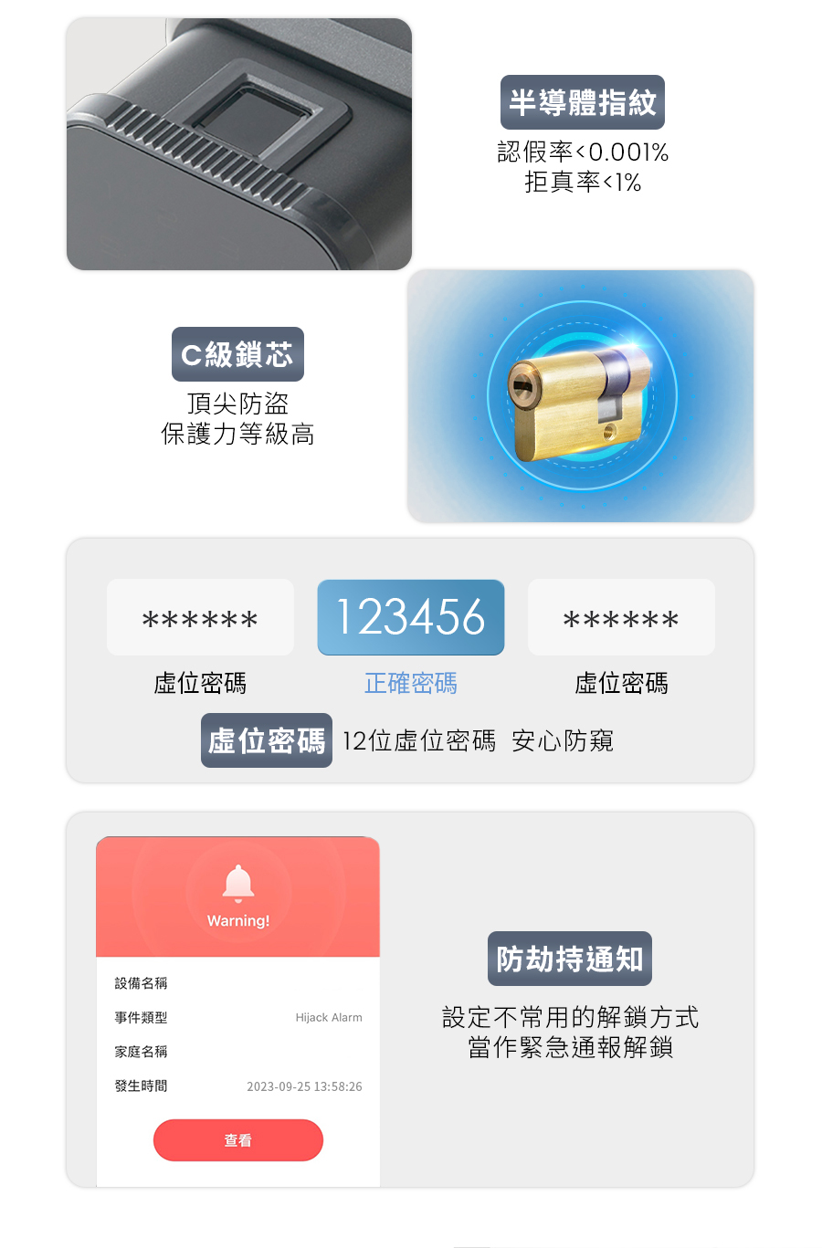 指紋/密碼/鑰匙/卡片/手機APP遠端解鎖/APP遠端臨時密碼 六種開鎖方式