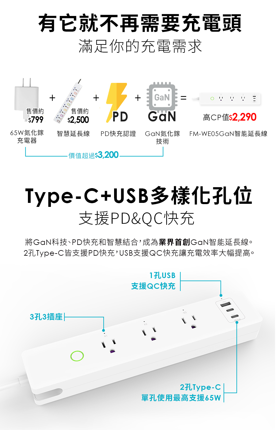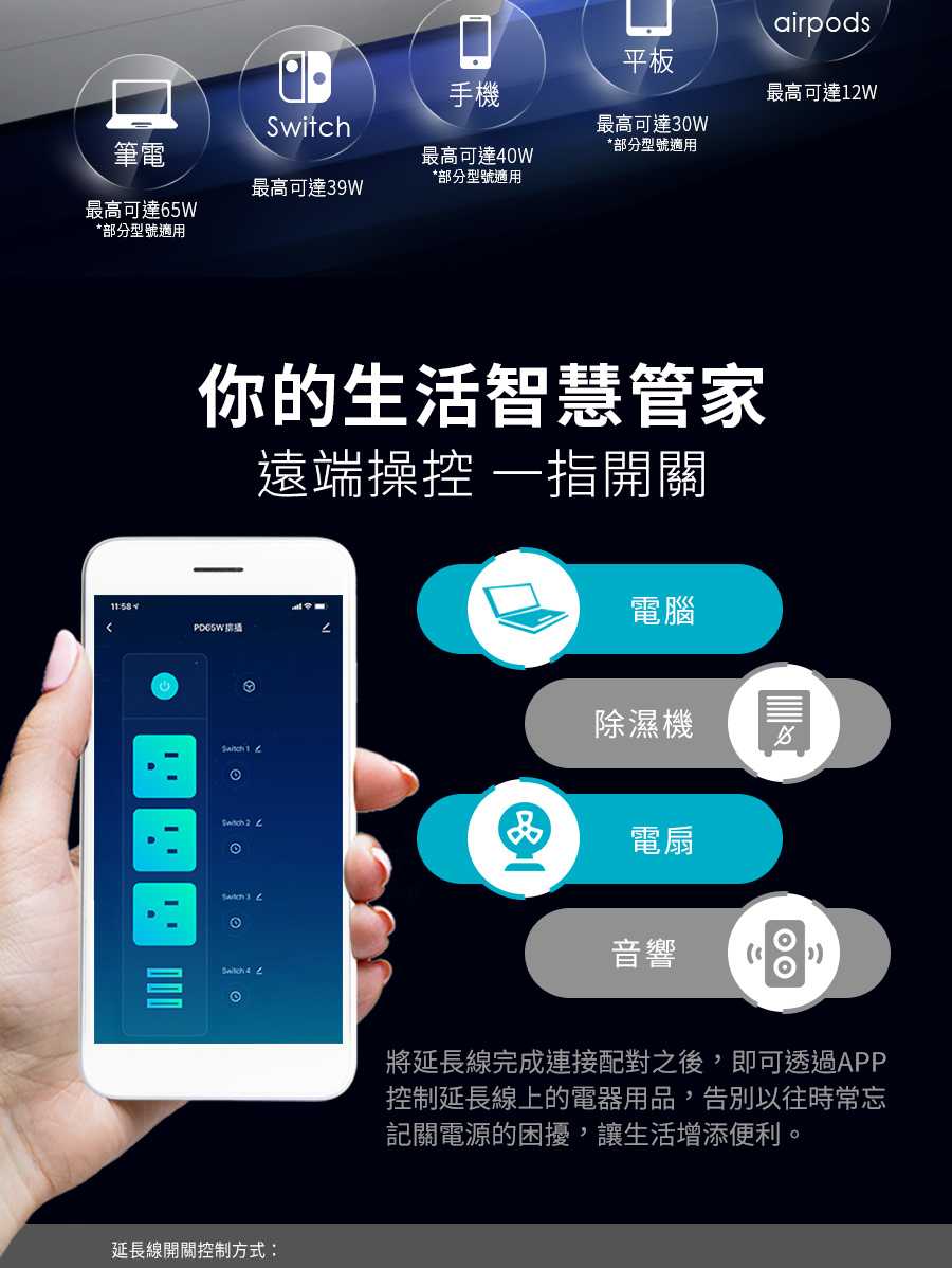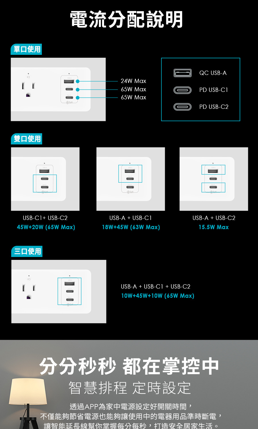 * 分控功能:排插共AC位3,1USB+2 TYPE C