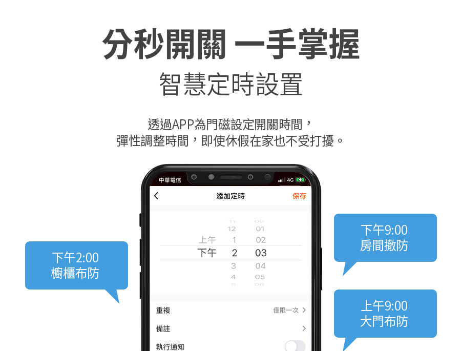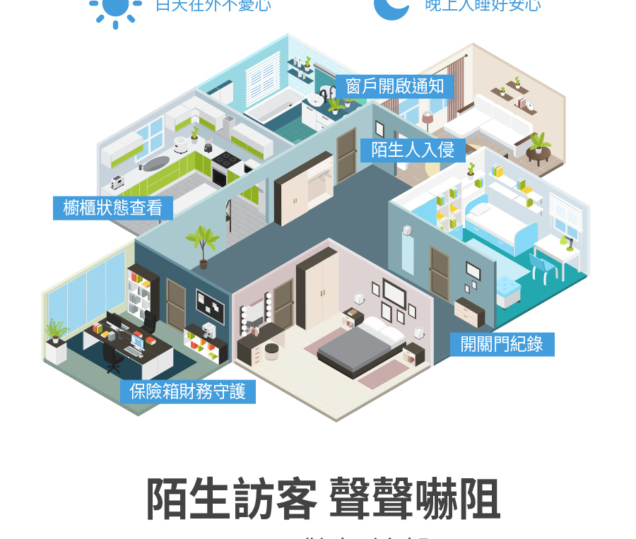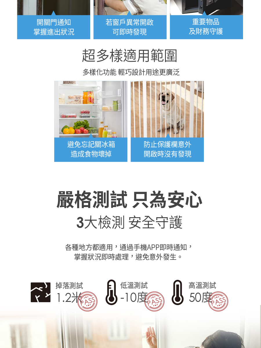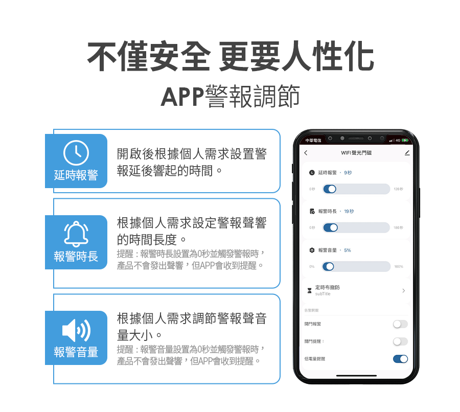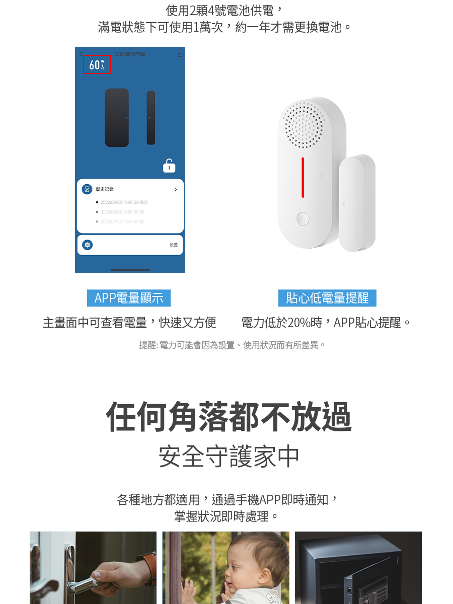 APP警報提醒 : 警報聲提醒、開門、關門提醒、低電量提醒