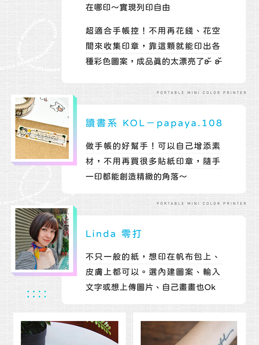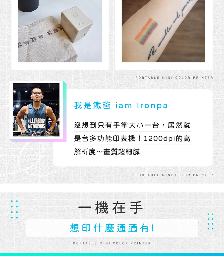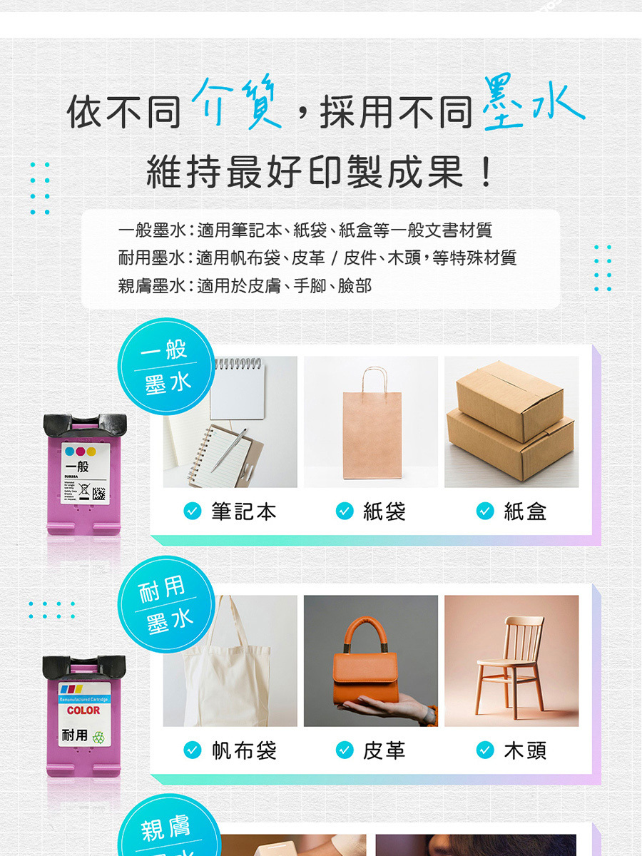 2.多材質、不同墨水,不論紙張 / 木作 / 皮件 / 皮膚,都牢牢印上!