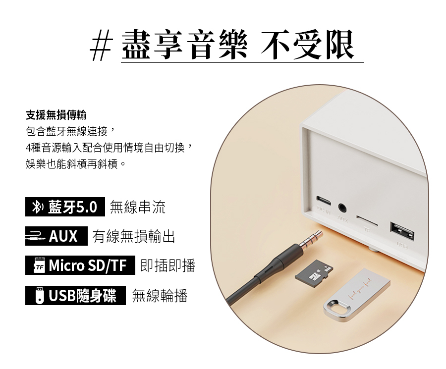 3. 支援多種音源(藍牙5.0、AUX、Mirco SD/TF、USB)