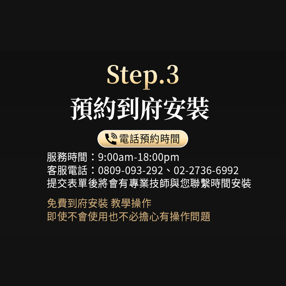 1.購買 2.預約填寫評估表單 3.免費到府安裝 4.現場專人教學