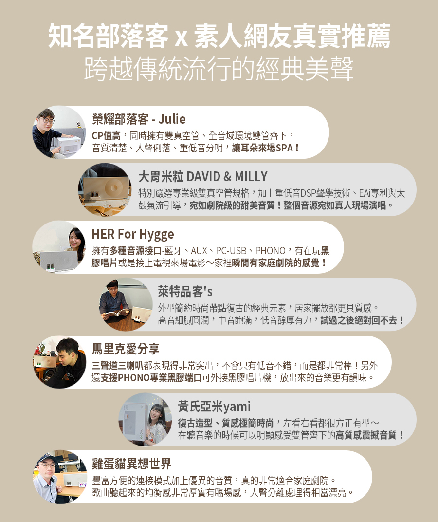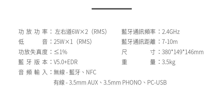 ●多種音源介面—藍牙、AUX、PC-USB、PHONO, 為消費者提供更多便利。