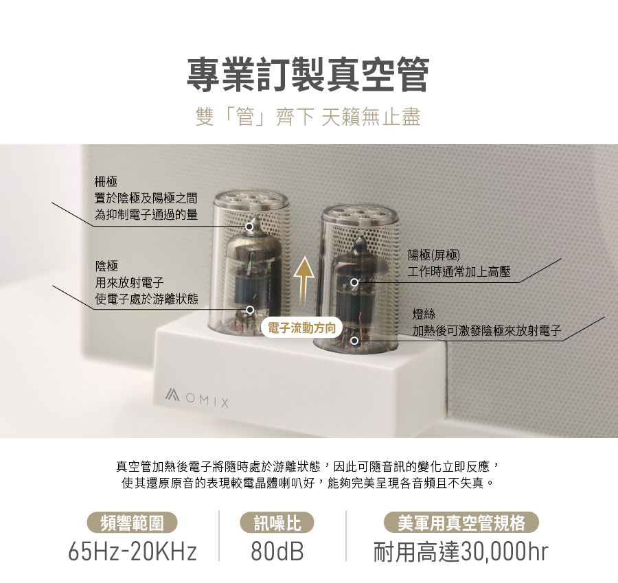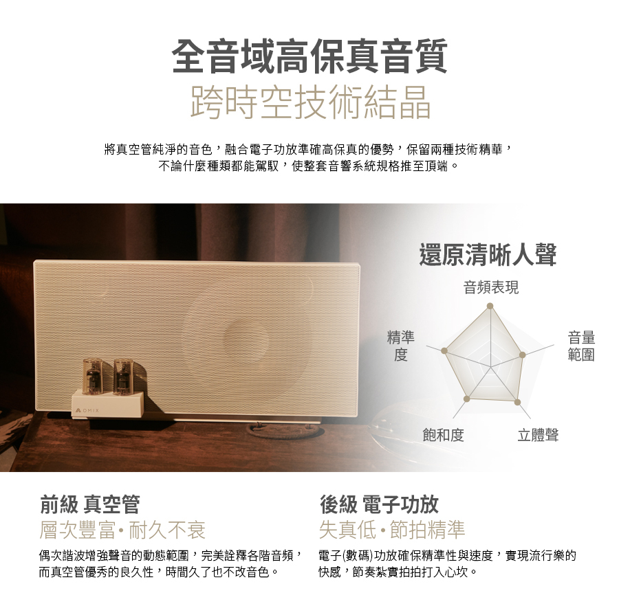 ●軍用級質量保證的電子管,應用在前級功放,與後級數碼功放完美匹配,揚長避短,將電子管音響系統的高音靚麗、中頻飽滿、低音醇厚而富有彈性的優勢充分發揮,同時,也將數碼音響的精準性和速度完全展現出來,使整套音響系統音色更加迷人。