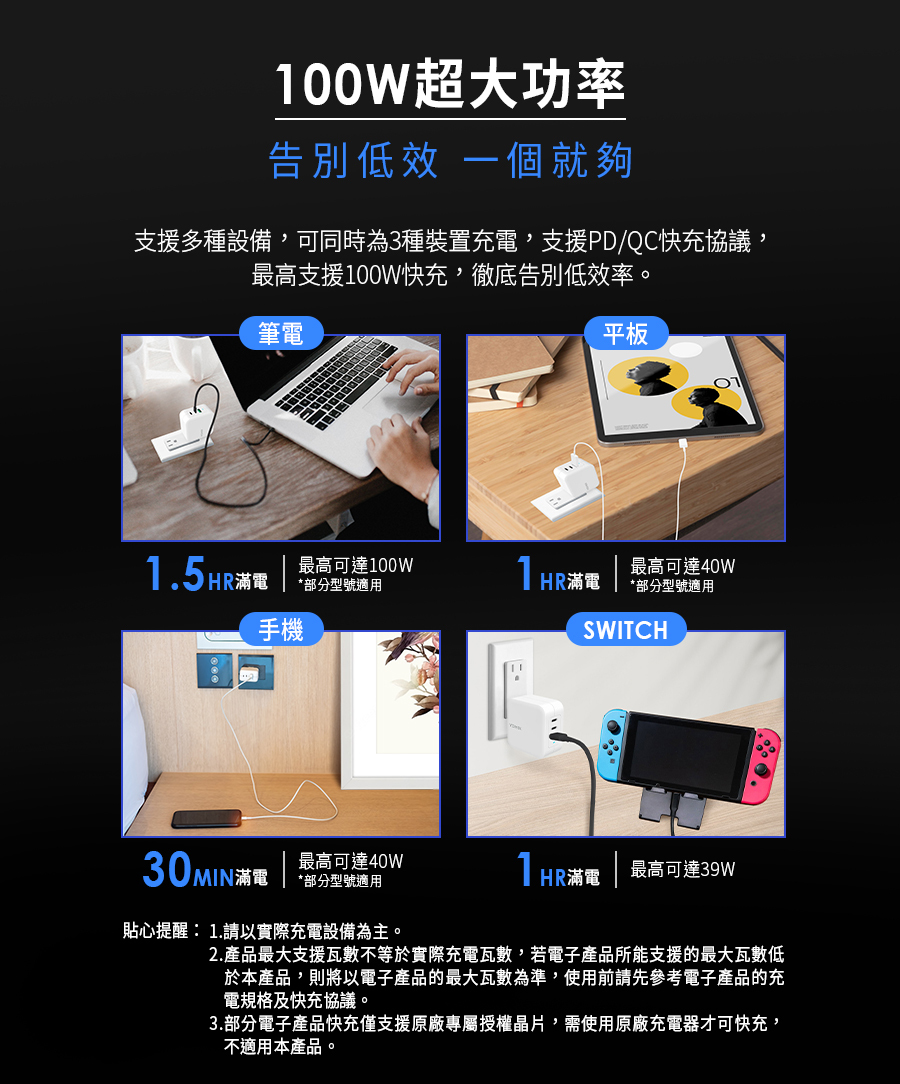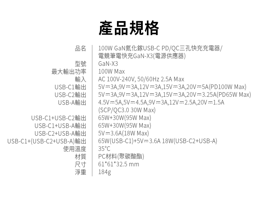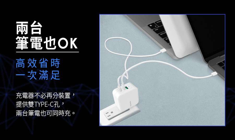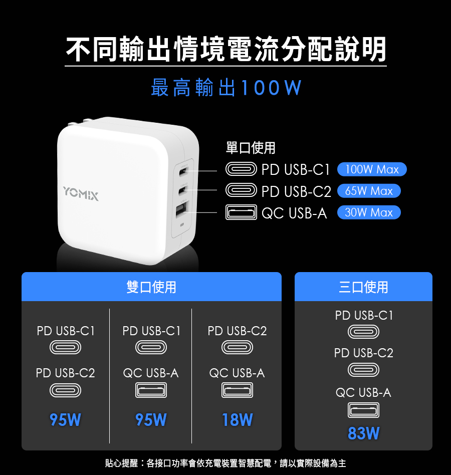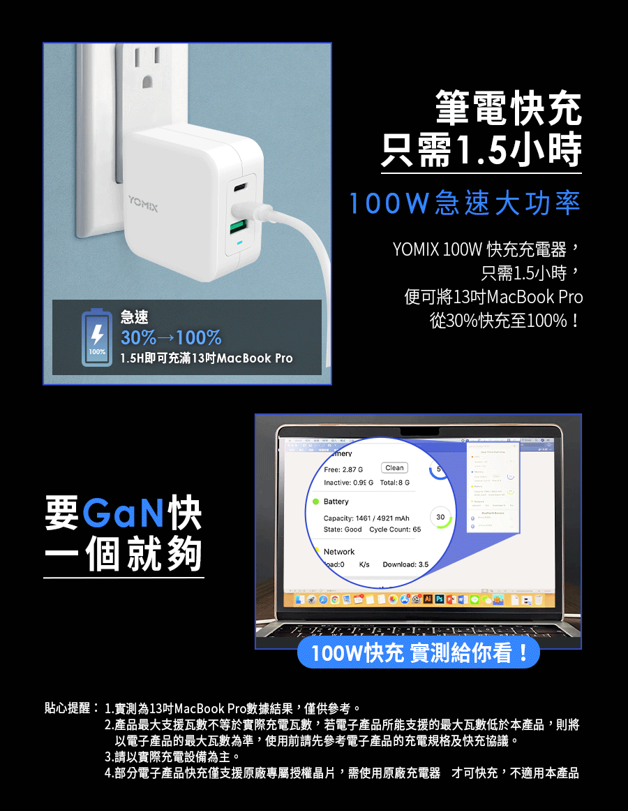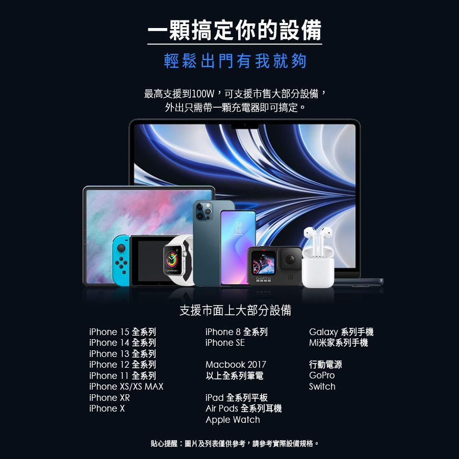 2.兩個USB-C輸出口單獨使用時支援100W、65W快充輸出,可以為主流筆記型電腦提供強大的電力支援,讓GPU、CPU處於滿電釋放性能下為使用者提供生產力。